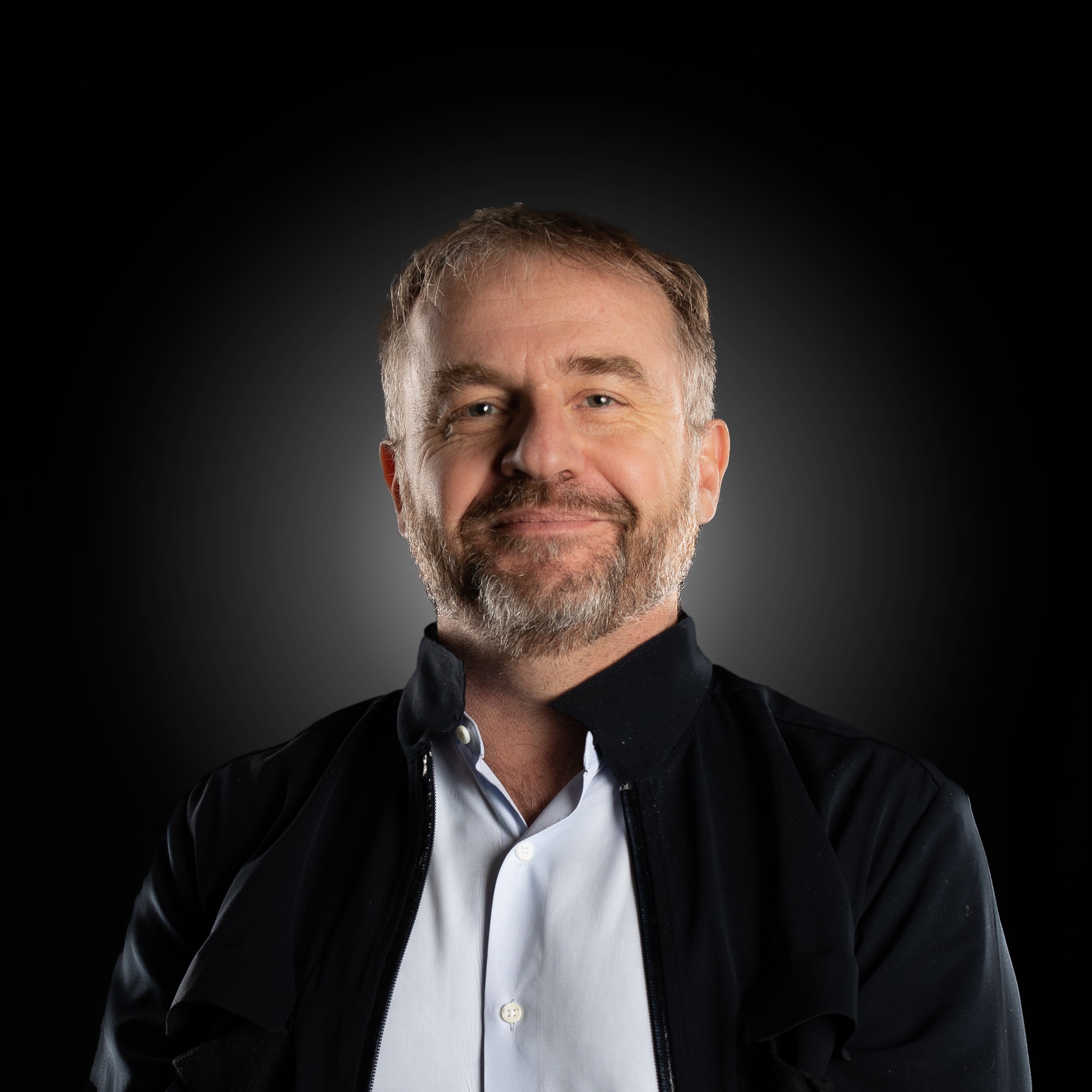 Portrait photo of Stephane Chatonsky. He is front of a dark backgournd and wearing a dark jacket and grey shirt.